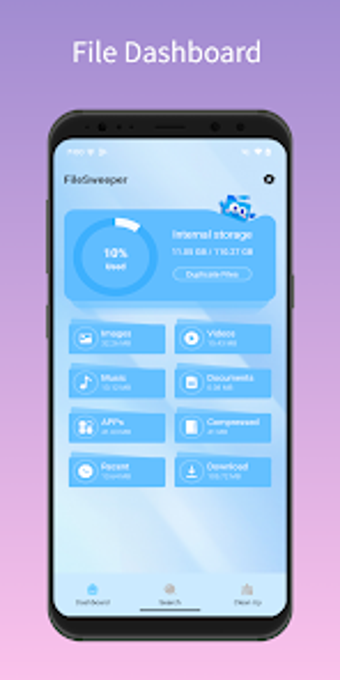 FileSweeper는 Android 장치를 위해 설계된 포괄적인 파일 관리자 및 클리너로, 사용자가 저장소를 효과적으로 조직하고 검색하며 관리할 수 있도록 합니다. 이 애플리케이션은 사용된 공간과 총 공간을 표시하는 원형 차트로 나타낸 시각적 저장소 개요를 특징으로 하여, 한눈에 저장 용량을 평가할 수 있게 합니다. 사용자는 파일을 이미지, 비디오, 오디오, 문서, APK, 다운로드 및 아카이브와 같은 구별된 유형으로 분류할 수 있어 빠른 탐색 및 관리가 가능합니다.